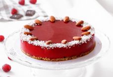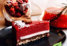 1410 г • в торте не используются продукты животного происхождения, в том числе молочные продукты. Основа - смесь орехов и финики. Далее слой шоколадного ганаша из шоколада и кокосового молока. Затем начинка из кокосового ванильного мусса и завершающий аккорд - малиновый заварной крем стабилизированный агар-агаром. Украшается миндалем и кокосовой стружкой.