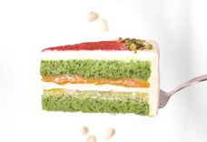 810 г, диаметр 16 см • Нежный фисташковый бисквит, соленая карамель, сливочный крем и груша, томленная в белом вине