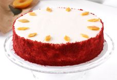 900 г • персик, вымоченный в виски, бисквит «красный бархат», японский крем намелака с карамелью, сливочный аккорд и кусочек натурального манго